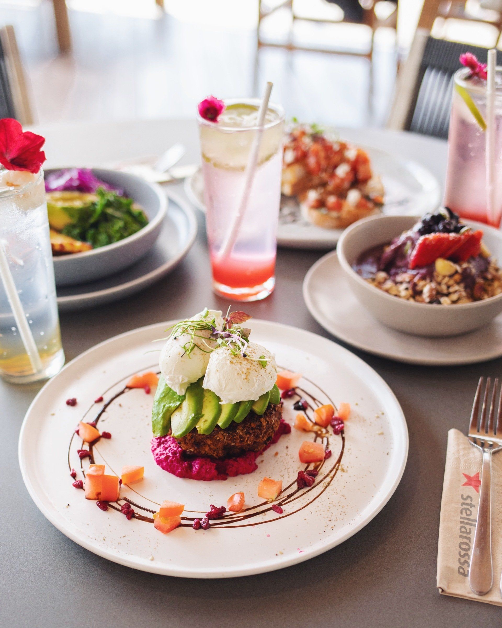 With beetroot hummus, dukkah sliced avocado, pomegranate salsa & a poached egg.